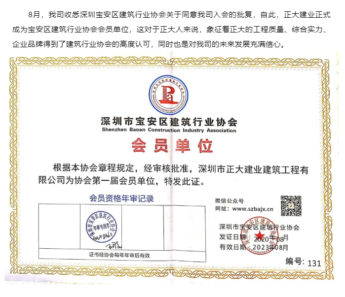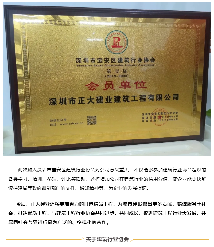 正式成為“深圳寶安區(qū)建筑業(yè)協(xié)會會員單位”! 中國建筑業(yè)協(xié)會于1986年10月成立,它是全國各地區(qū)、各部門從事土木工程、建筑工程、線路管道設備安裝、建筑裝修裝飾和科研等企事業(yè)單位、地方建筑業(yè)協(xié)會、部門建筑業(yè)協(xié)會及有關專業(yè)人士自愿參加組成的全國性行業(yè)組織,30多年來,中國建筑業(yè)協(xié)會在在政府主管部門的領導和支持下,推進施工企業(yè)規(guī)范發(fā)展和創(chuàng)新管理水平,培育品牌企業(yè),加強行業(yè)間、企業(yè)間、國際間的交流與合作;服務于企業(yè),服務于社會,為企業(yè)與政府之間架起一條溝通的橋梁和紐帶,促進建筑企業(yè)做強做大、又好又快地持續(xù)健康發(fā)展。